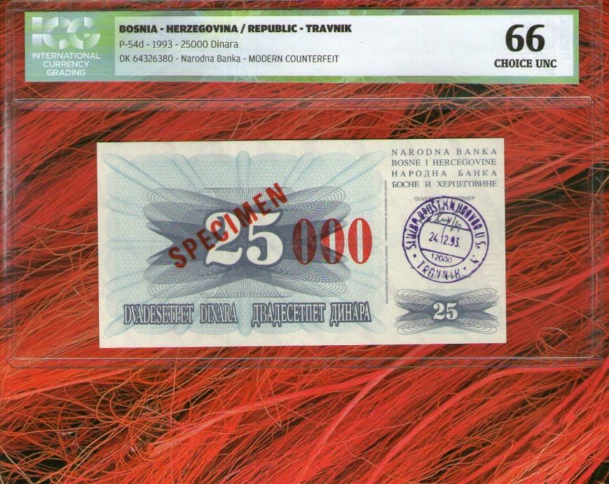 BOSNA BOSNIA TRAVNIK 25 000 DINARA 1992 P SCARE SPECIMEN UNC GRADING I