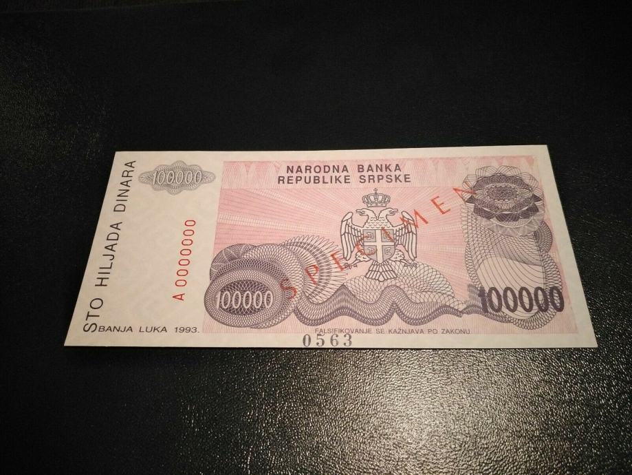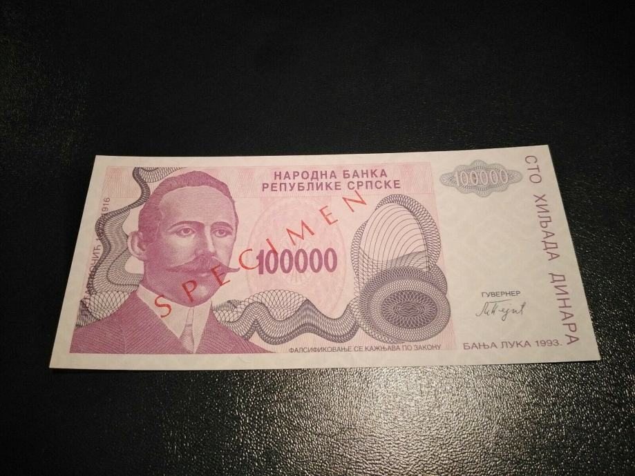 Bosna Yugoslavia Banja 100000 Petar Kočić dinara 1993 UNC SPECIMEN