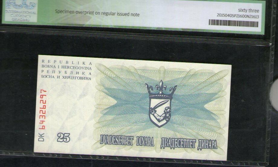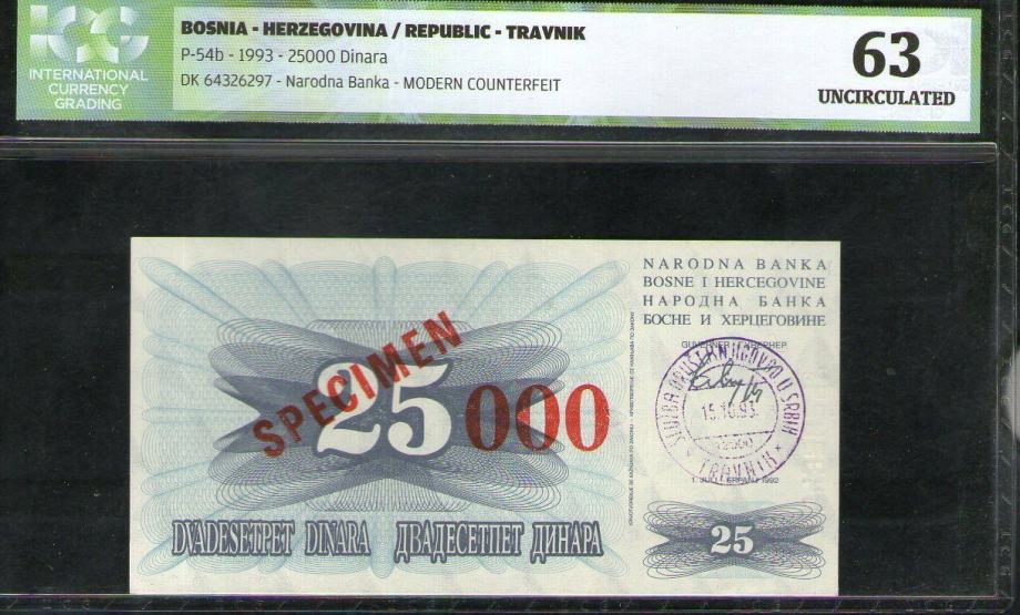BOSNIA 25 000 DINARA 1992 P SCARE SPECIMEN UNC GRADING ICG