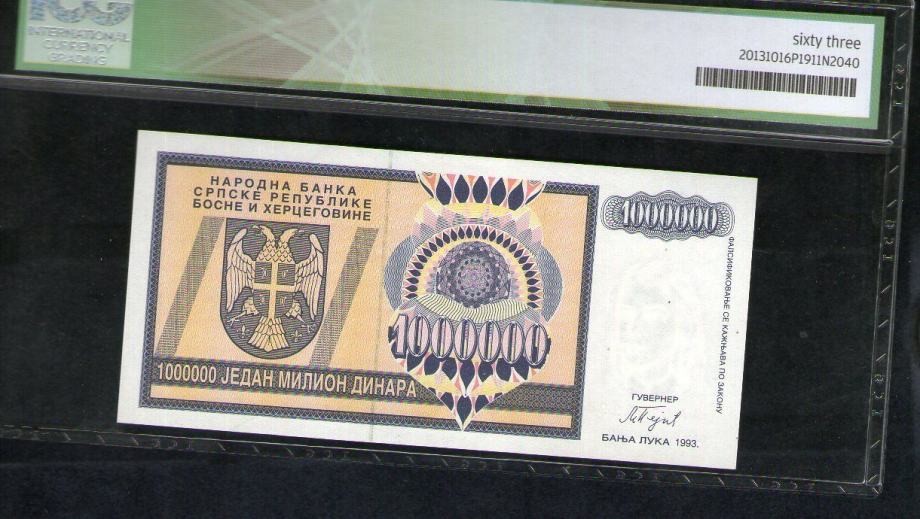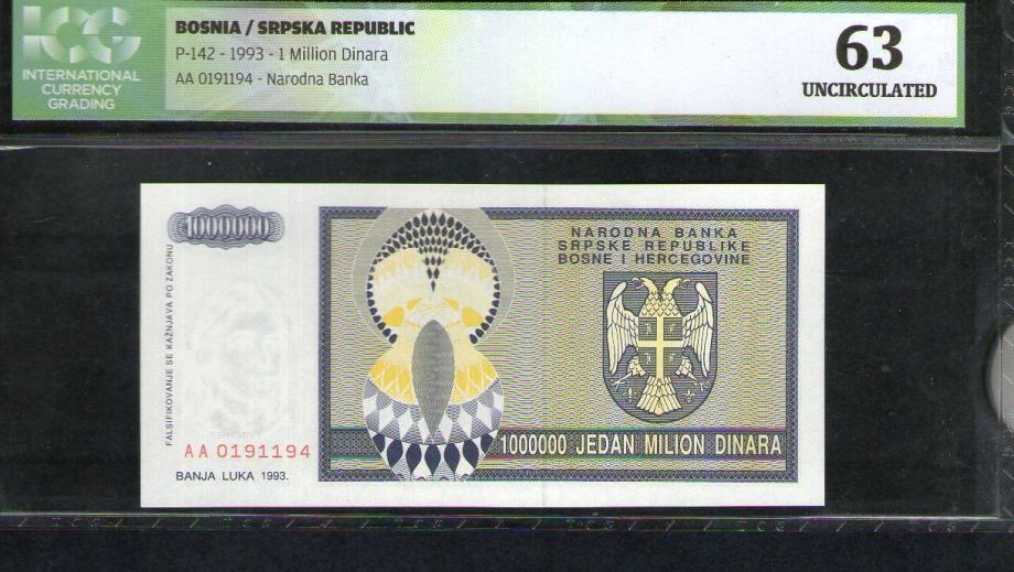 Bosnia BOSNA 1 MILLION DINARA 1993 P 142 G. UNC GRADING ICG
