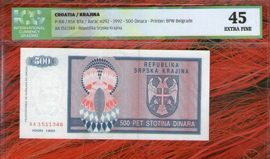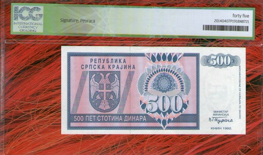 Croatia Hrvatska KNIN 500 dinara 1992 GRADING ICG
