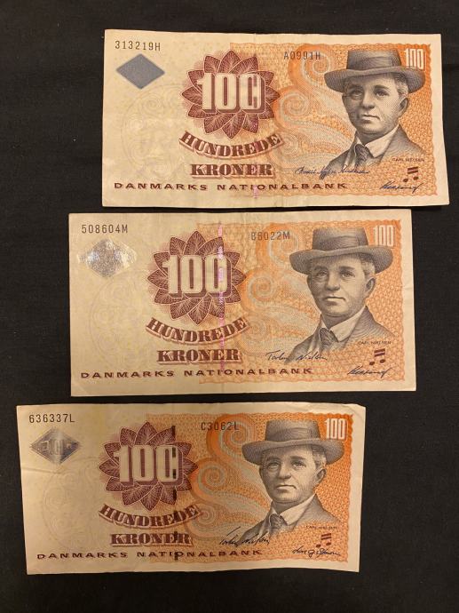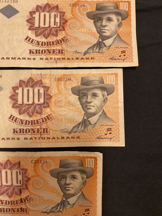 Serija: Kronesedlerne 8. broj - Slavni muškarci i žene Avers Uglavnom identičan tipu 1, ali je dodano više sigurnosnih značajki. Crveno smeđa i crna na narančastoj pozadini. Na desnoj strani portret poznatog skladatelja Carla Nielsena, s notom i tekstom ”Carl Nielsen” i 3 stilizirana puža. Gore lijevo hologram u obliku romba s bilješkama, "C (za sto) i "100" mogu se vidjeti ovisno o tome kako je novčanica postavljena.