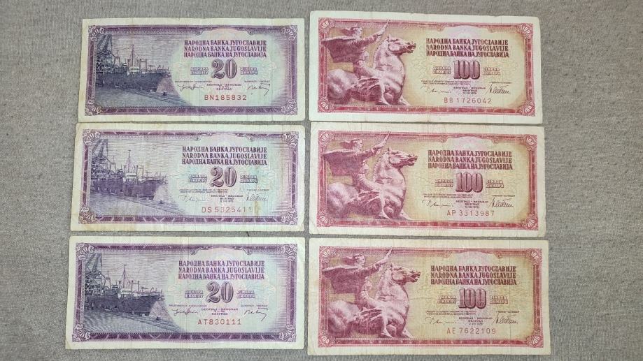 Prodajem lot sa šest novčanica ex YU,3x100 Dinara i 3x20 Dinara.Stanje vidljivo na slikama.