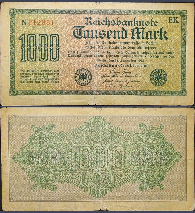 Novčanica: GERMANY / NJEMAČKA (1922) 1000 Mark - Vodoznak: Trnje