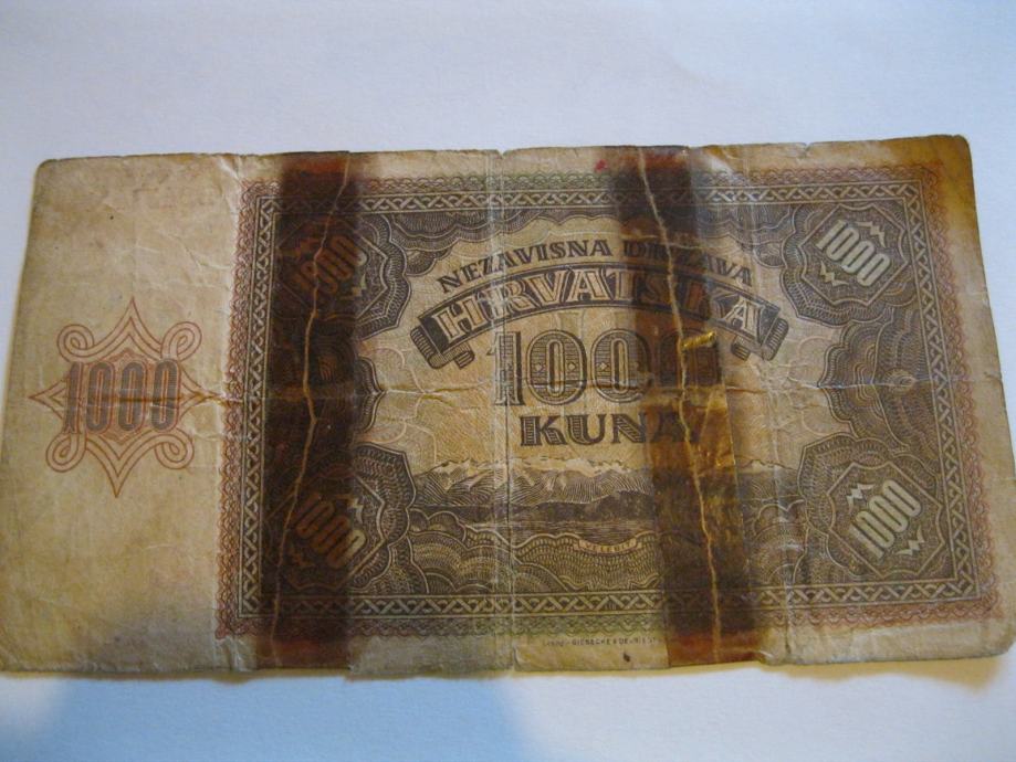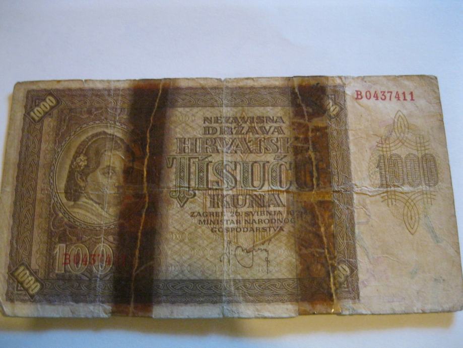 iz razdoblja NDH,apoen od 1000 kuna,izdana 26.05.1941,novcanica je ostecena ljepljena,broj serije-BO437411.