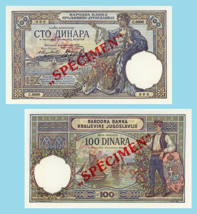 JUGOSLAVIJA 100 DINARA 1929 - SPECIMEN