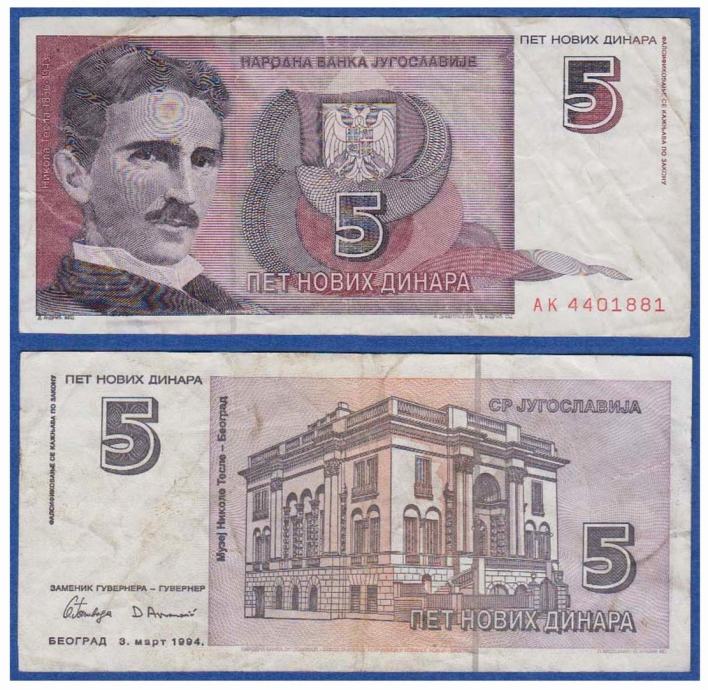 JUGOSLAVIJA i CRNA GORA YUGOSLAVIA & MONTENEGRO 5 NOVIH DINARA 1994