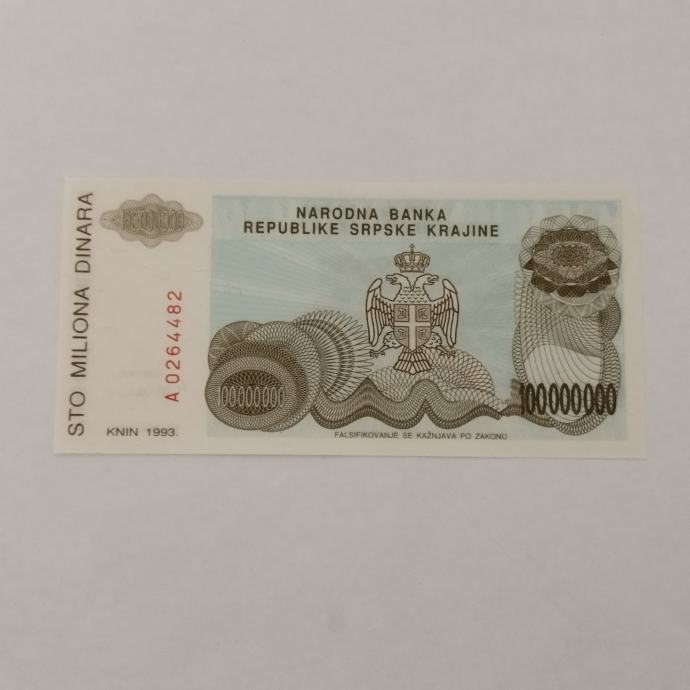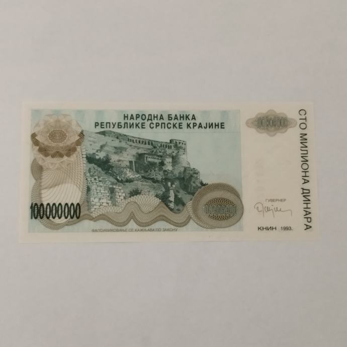 KNIN 100 000 000 DINARA 1993 GODINA UNC