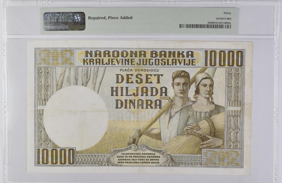 Kraljevina Jugoslavija 10000 Dinara 1936 PMG 30 Repaired, Piece Added