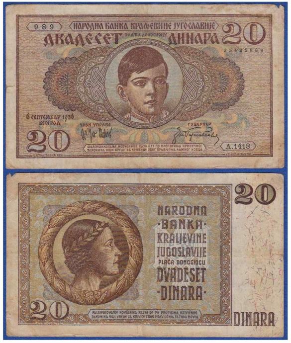 KRALJEVINA JUGOSLAVIJA YUGOSLAVIA 20 DINARA 1936