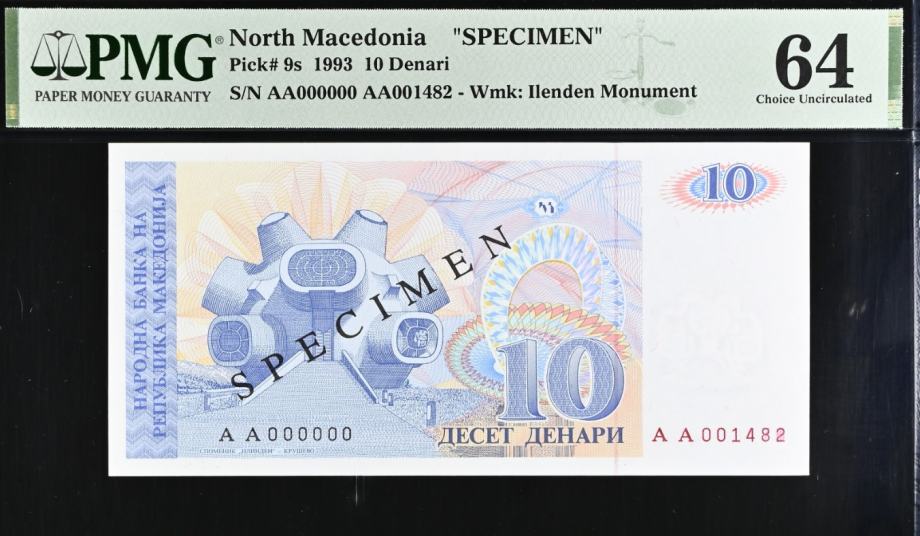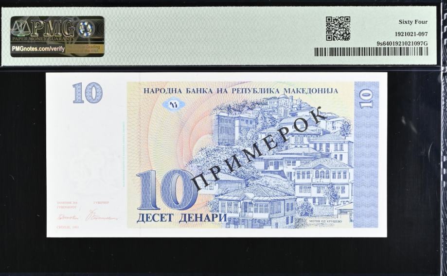 MAKEDONIJA 10 DENARI 1993 PMG 64 UNC SPECIMEN