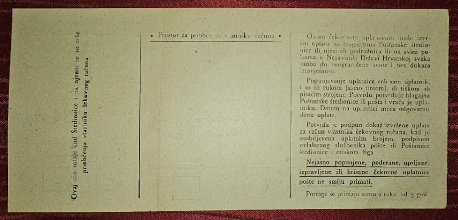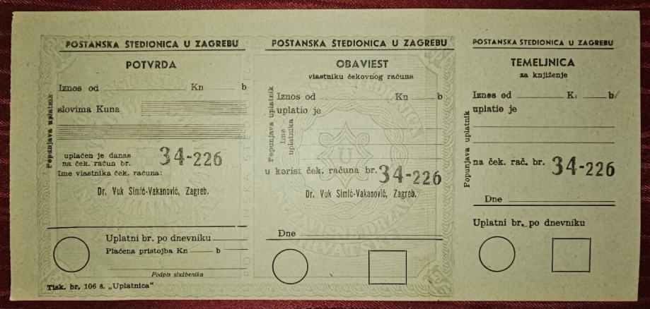 NDH- ČEKOVNA UPLATNICA, DR. VUK pl. SIMIĆ VAKANOVIĆ, RIJETKO!