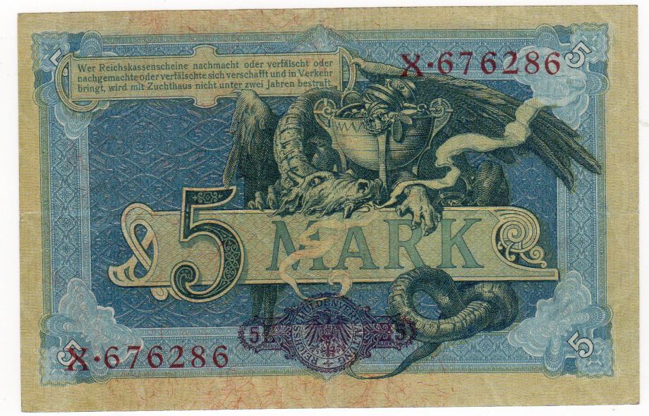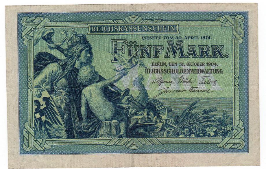 prodaje se novčanica njemačka 5 maraka 1904 godina u dobrom stanju očuvana rjeđe u prodaji u ovakvom stanju