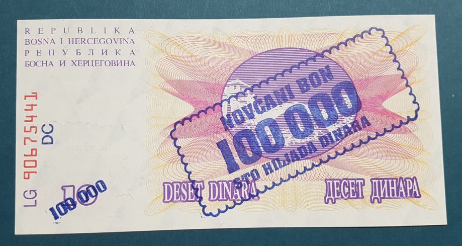 NOVČANI BON 100 000 STO HILJADA DINARA BOSNA I HERCEGOVINA 1993. NOVA
