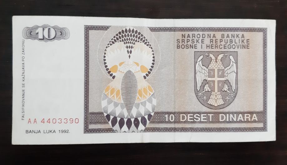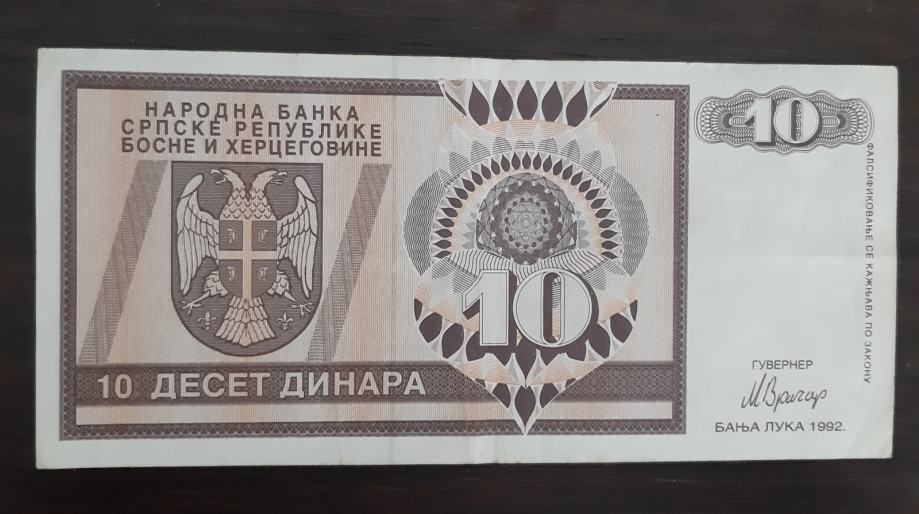 Novčanica 10 dinara ('Srpska republika BiH'; 1992. Banja Luka)