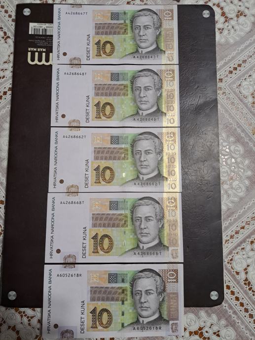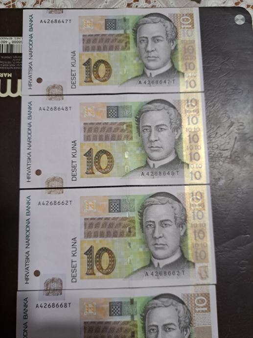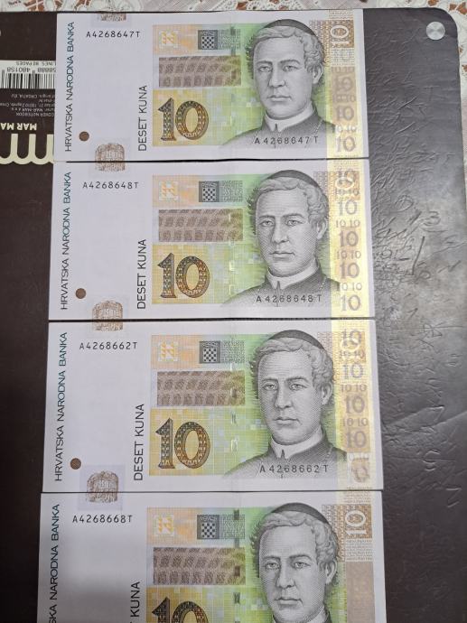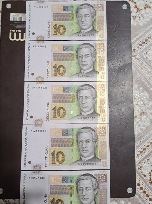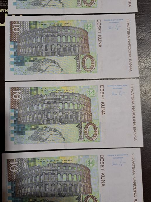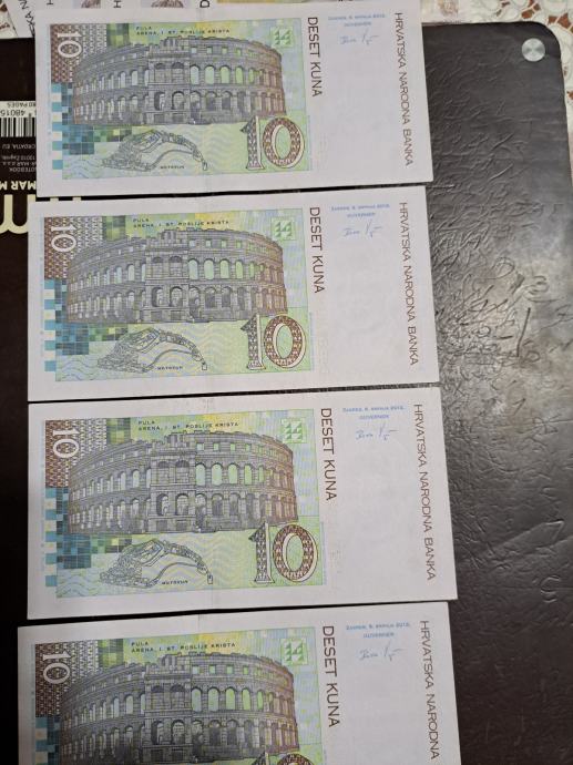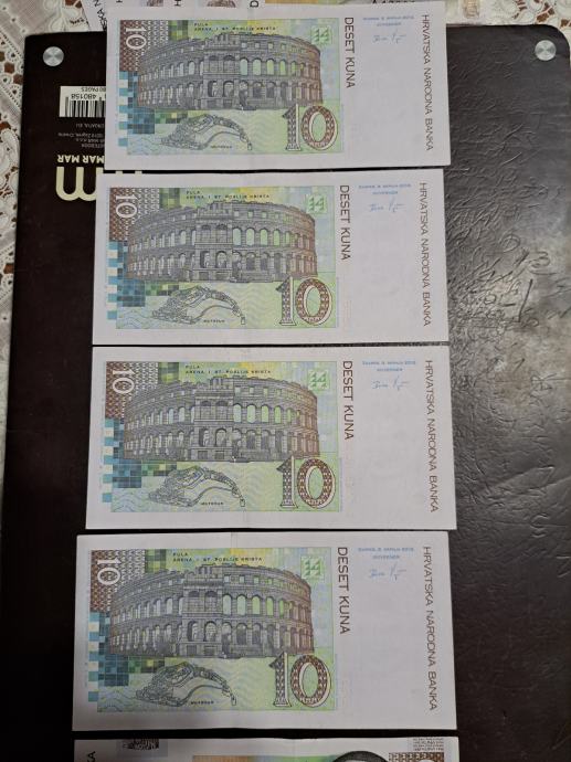 Prodajem novcanice od 10 kuna, izdane 2012.godina, u super sačuvanom stanju novo UNC, cijena po komadu 5,50 eura. Upitati na broj mobitela 095 822 8933 ili putem SMS-a, Viber, Vhatsap, te putem njuskala. Moguća dostava na vašu adresu putem HP-a preporučenom pošiljkom ili putem Tiska stvar dogovora +3 eura troškovi dostave. Pogledajte sve moje oglase.
