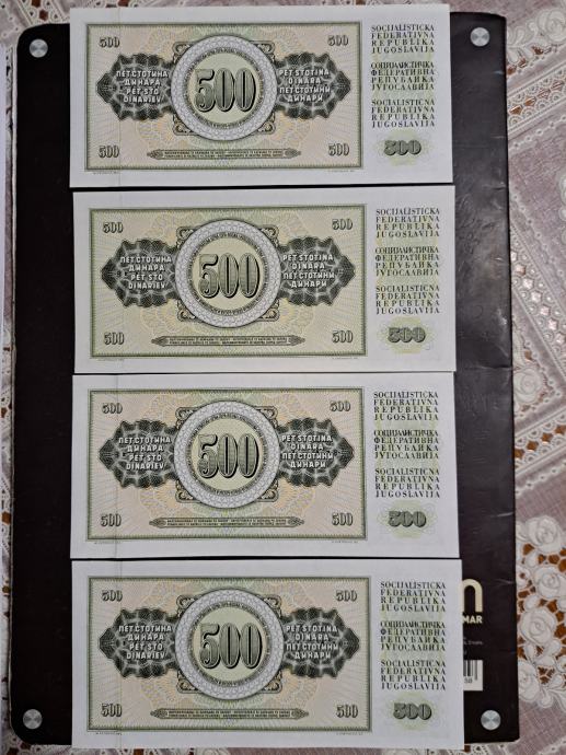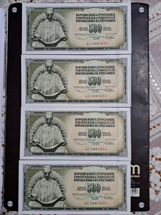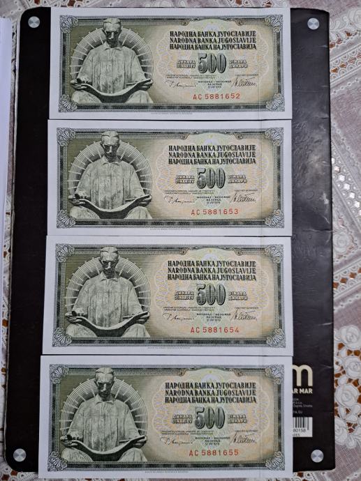 Prodajem novcanice od 500 Dinara iz vremena Jugoslavije, brojevi u nizu, izdane, 1978.godine u UNC stanju cijena, 3 eura po komadu. Upitati na broj mobitela 095 822 8933 ili putem SMS-a, Viber, Vhatsap, te putem njuskala. Moguća dostava na vašu adresu putem HP-a preporučenom pošiljkom ili putem Tiska, Box now +3 eura troškovi dostave. Pogledajte sve moje oglase.