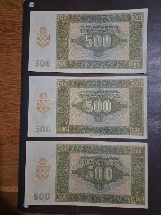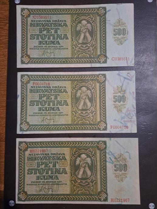 Prodajem novcanice od 500 kuna izdane 1941.godine,u sačuvanom stanju kvaliteta VF+ do XF , cijena po komadu 25 eura.Upitati na broj mobitela 095 822 8933 ili putem SMS-a, Viber, Vhatsap, te putem njuskala. Moguća dostava na vašu adresu putem HP-a preporučenom pošiljkom ili putem Box now, Tiska, + 3 eura troškovi dostave, stvar dogovora. Pogledajte sve moje oglase.