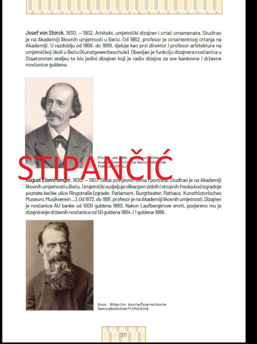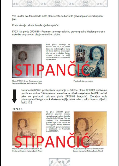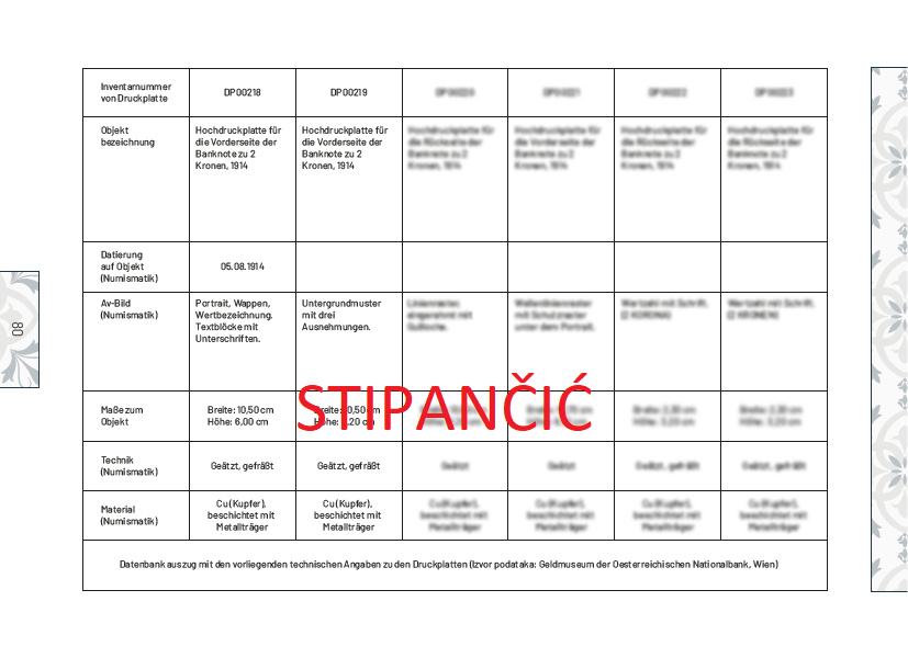 • Izrada ploča za tisak i tiskanje novčanica: Korak po korak opisan je cijeli tadašnji postupak od ideje za novčanicu, skica i predložka za novčanicu, nacrta do graviranja nulte ploče i galvanoplastičkog umnožavanja tih gravura do konačne izrade tiskarske ploče s mnogo klišeja za tisak novčanica na jednoj ploči. Sve zajedno je poduprto s puno informacija koje je autor knjige pridobio iz prve ruke od voditelja i osoblja Geldmuseum Wien, kao i tabelama s tehničkim podacima o pločama za tisak i 31 fotografijom tadašnjih različitih ploča za tisak koje se pohranjuje u novčanom muzeju Beč ( Geldmuseum Wien). S fotografijama velikih dimenzija prikazuju se ploče za tisak slijedećih novčanica: