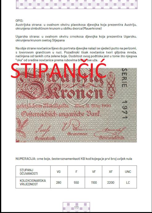 • Kataloška obrada novčanica: Fotografski prikaz i opis svih 22 krunskih novčanica te 7 novčanica guldena, mnoge zanimljivosti u vezi pojedine novčanice, analiza novčanica iz umjetničko-ikonografske perspektive, te navedba kolekcionarskih vrijednosti novčanica (izraženo u €) za pet razina kvalitete (VG,F,VF,XF,UNC).