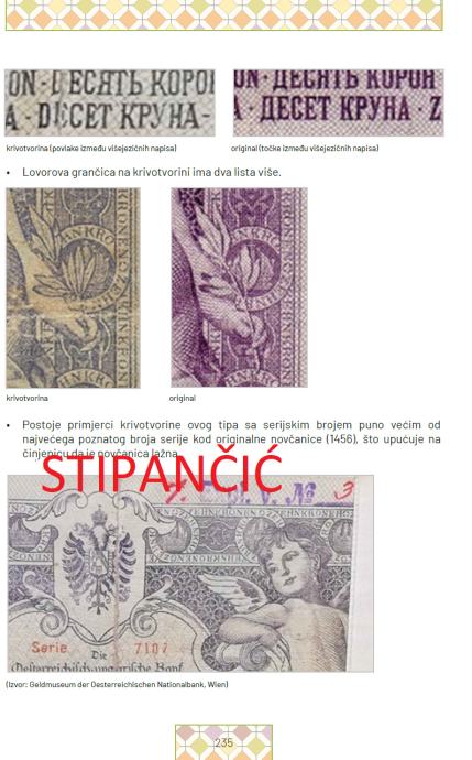 • Onovremene krivotvorine: S mnogobrojnim fotografijama i opisno u knjizi se nastoji predstaviti najpoznatije i najćešće tadašnje krivotovrine bankovnih i državnih novčanica. Detaljan prikaz mnogih službenih oznaka krivotvorina zatečenih u optjecaju (varijante žigova, perforacije i rukopisnih označba). Poglavlje obuhvaća također opširan istraživači sastavak kojeg bi mogli i nazvati numizmatička proza, u kojem se opisuje događaj uhićenja i životna priča jednog tad najupečatljivijeg krivotovritelja novčanica tadašnjeg vremena. Sve skupa je poduprto fotografijama krivotvoritelja i krivotvorina koje je izrađivao.