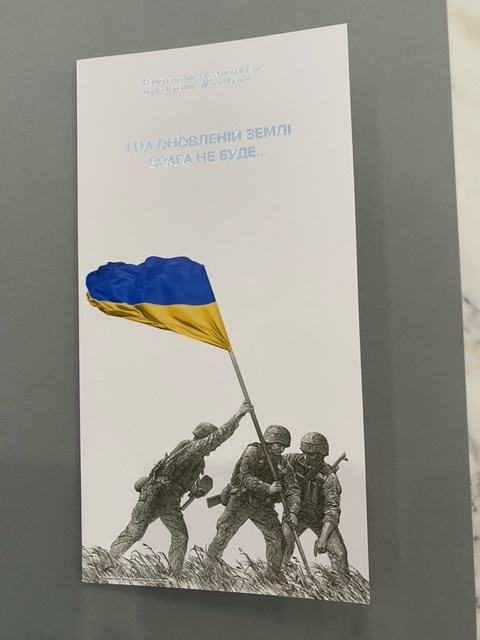 Avers - tri ukrajinska vojnika koji ističu ukrajinsku državnu zastavu (fotografija pod nazivom „Ukrajinski vojnici ističu zastavu“ autora Oleksandra Smirnova)