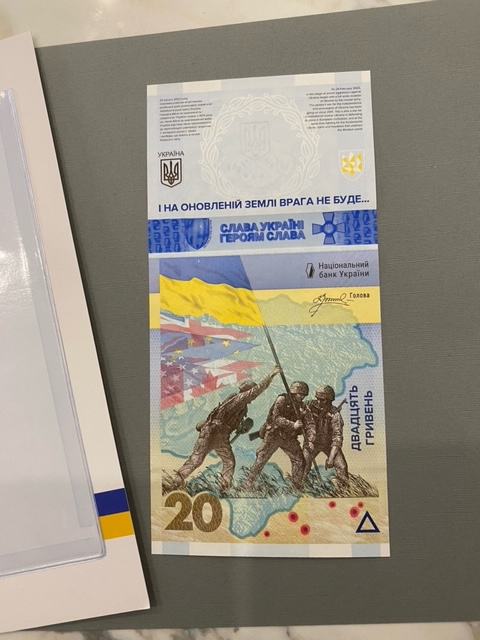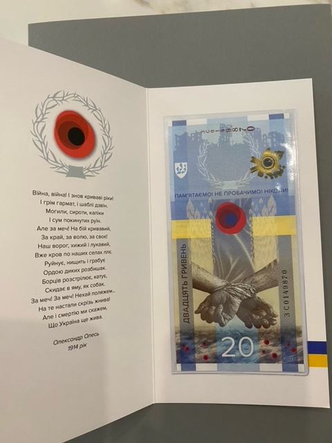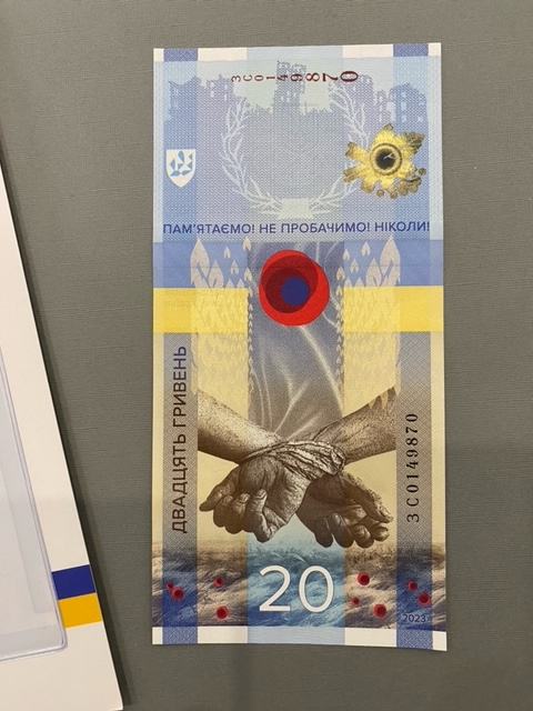 Prigodna novčanica od 20 ukrajinskih grivni s natpisom „NEĆEMO ZABORAVITI! NEĆEMO OPROSTITI!“ UNC