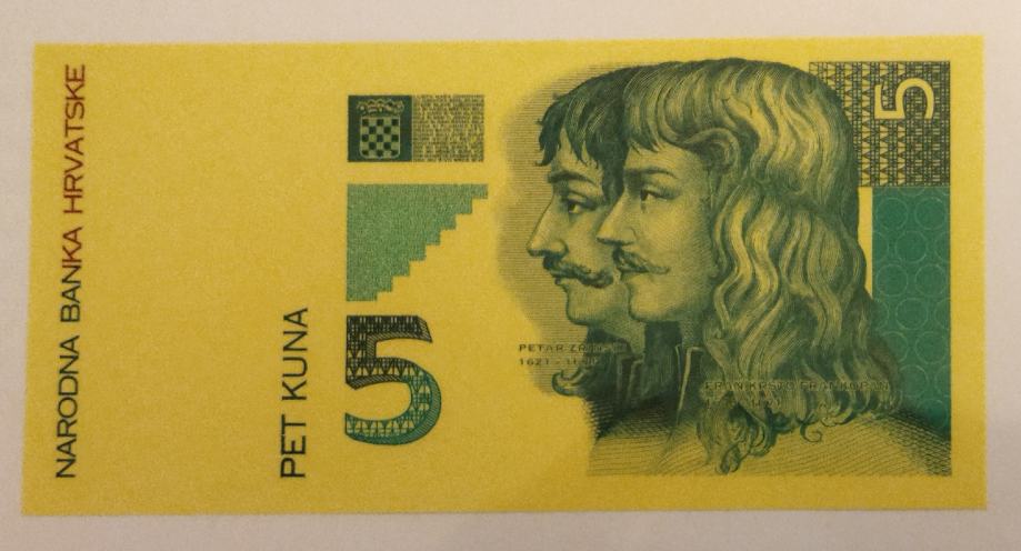 Probni otisak novčanice od 5 kuna, avers. Otisnut 1993. na istim strojevima na istim pločama istim bojama kojima su se tiskale kune u tiskari GIESECKE & DEVRIENT u Muenchenu.
