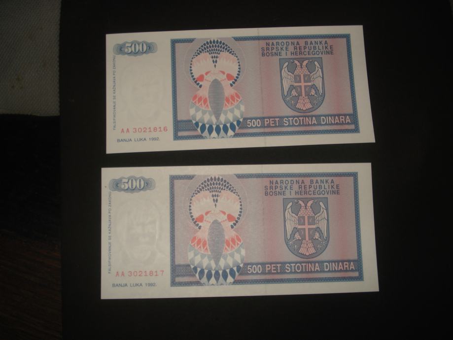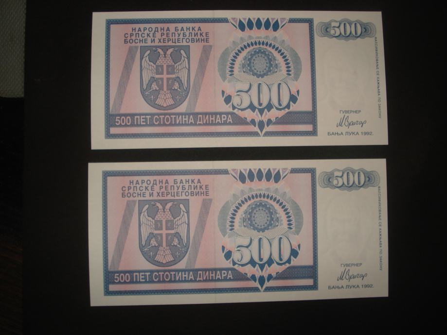 R.Srpska Banja Luka 500 dinara 1992.UNC (2 kom)