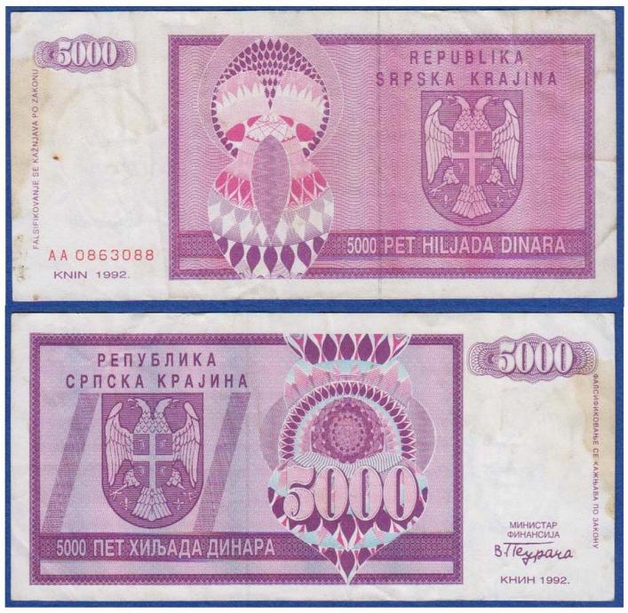 REPUBLIKA SRPSKA KRAJINA KNIN 5 000 DINARA 1992