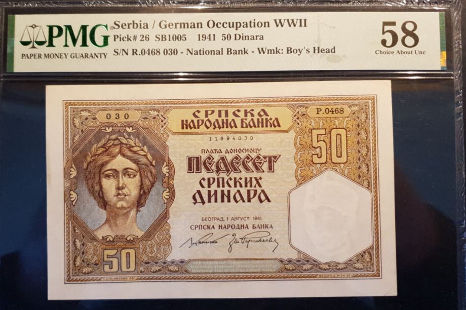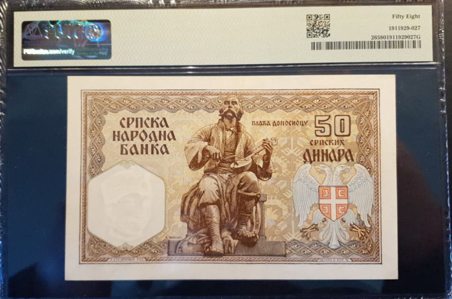 SRBIJA 50 DINARA 1941 PMG 58 aUNC