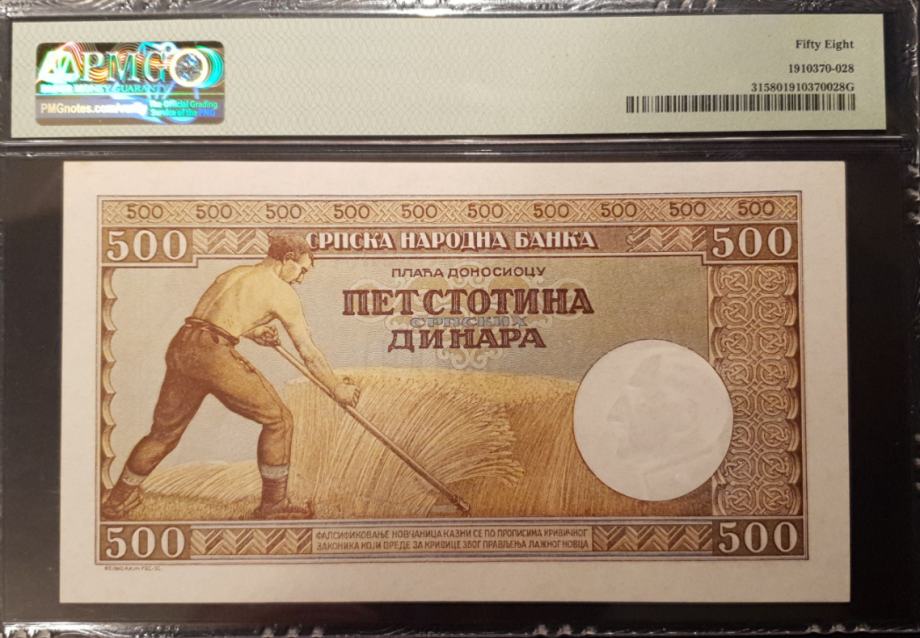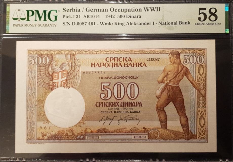 SRBIJA 500 DINARA 1942 PMG 58 aUNC