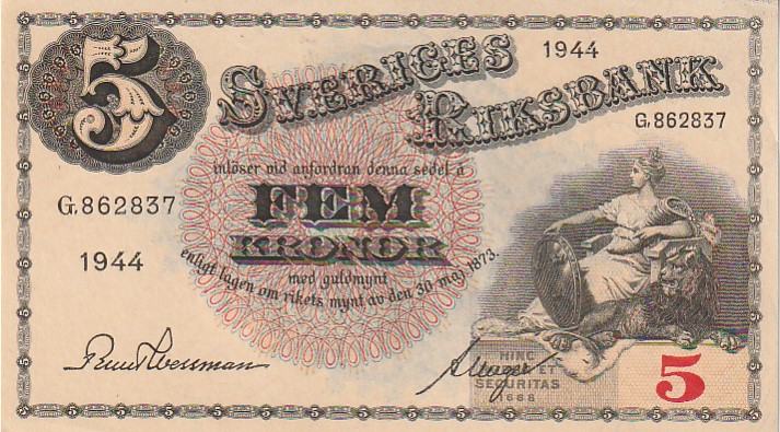 SVERIGES 5 KRONOR 1944 UNC