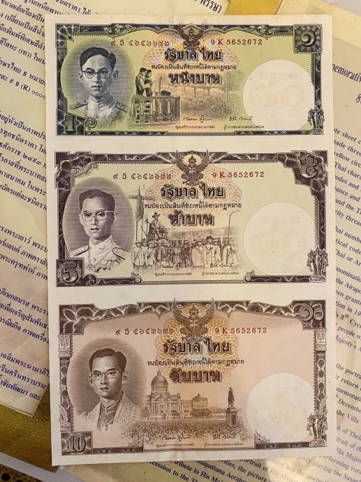Novčanica od 5 bahta prikazuje portret Njegovog Veličanstva u kraljevskoj procesiji kopnom, u povodu njegovog trećeg rođendana 1963. godine.