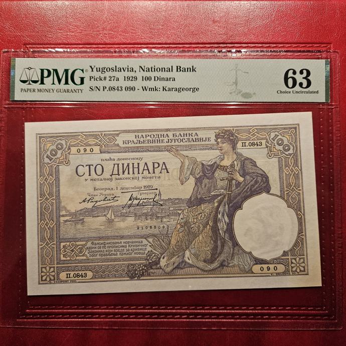 YU 100 DINARA 1929 PMG 63 UNC WM OBRENOVIĆ / RIJETKO