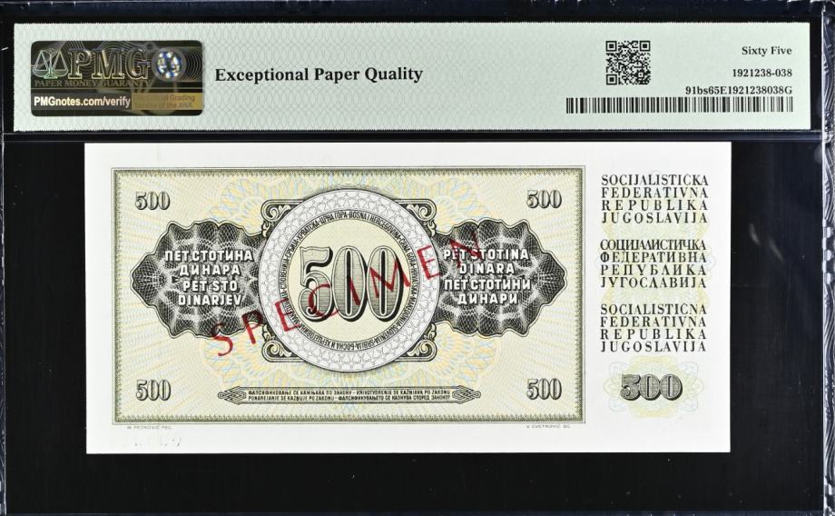 YU 500 DINARA 1981 SPECIMEN PMG 65 EPQ
