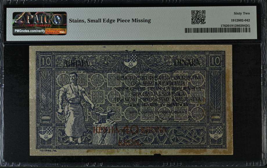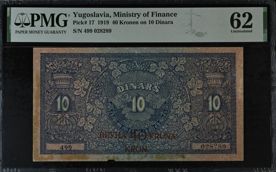 YUGOSLAVIA 10 DINARA / 40 KRUNA 1919 PMG 62 UNC