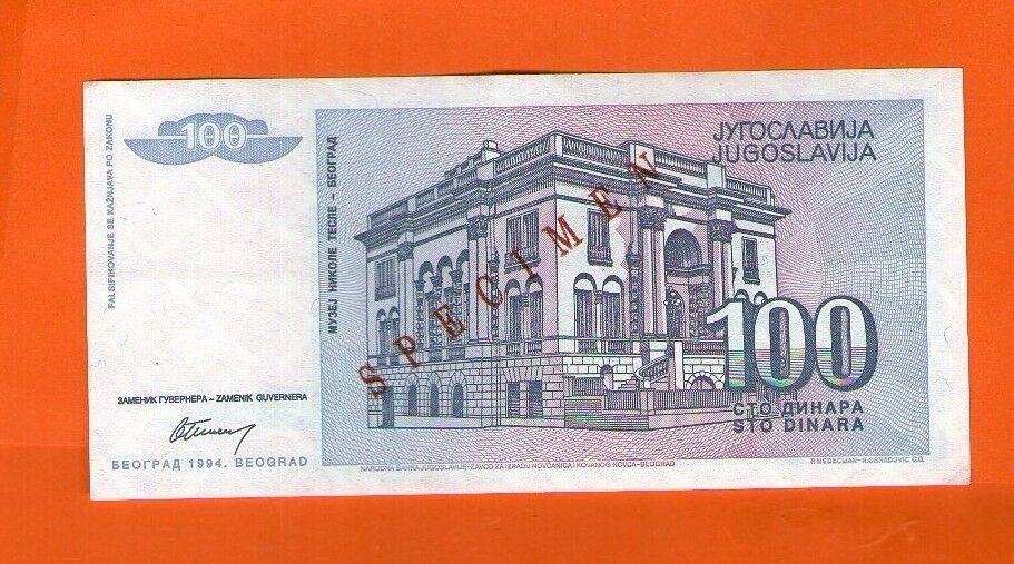 Yugoslavia 100 Dinara 1994 P-139s SPECIMEN rare BANKNOTE ! -no 25