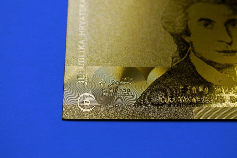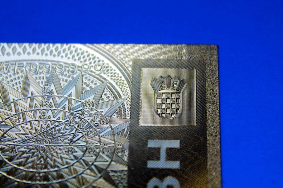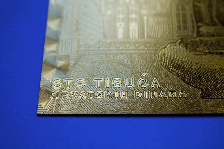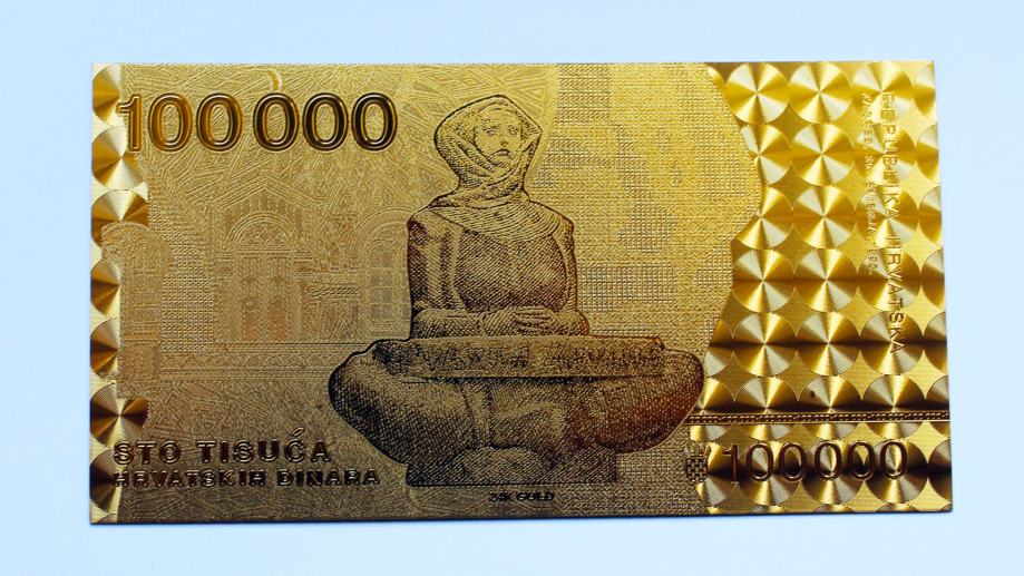 Kupac dobiva zlatnu poliesternu novčanicu Republike Hrvatske nominalne vrijednosti 100 000 hrvatskih dinara (HRD) izdane 30. svibnja 1993.