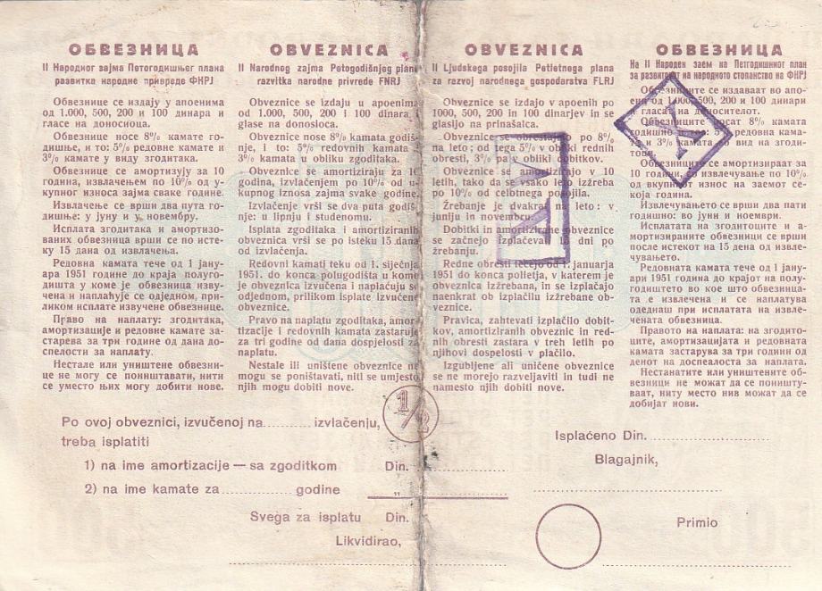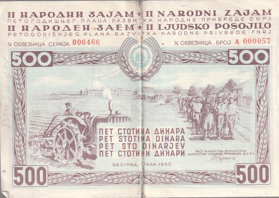 FNRJNARODNI ZAJAM 500 DINARA 1950