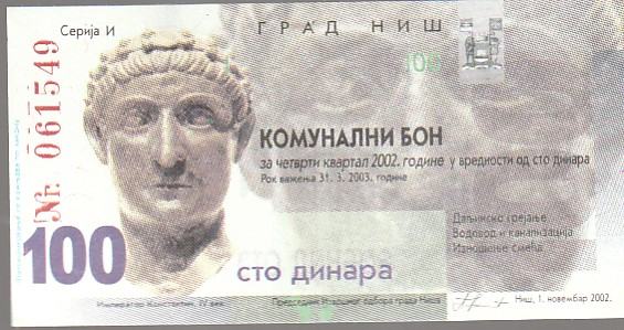 KOMUNALNI BON 100 DINARA NIŠ 2002 G