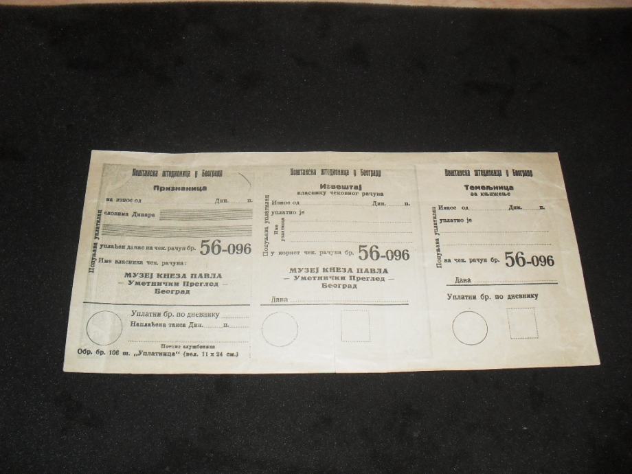 Štampa - Muzej Kneza Pavla - Umetnički Pregled Beograd. Vodeni žig na levoj polovini uplatnice.