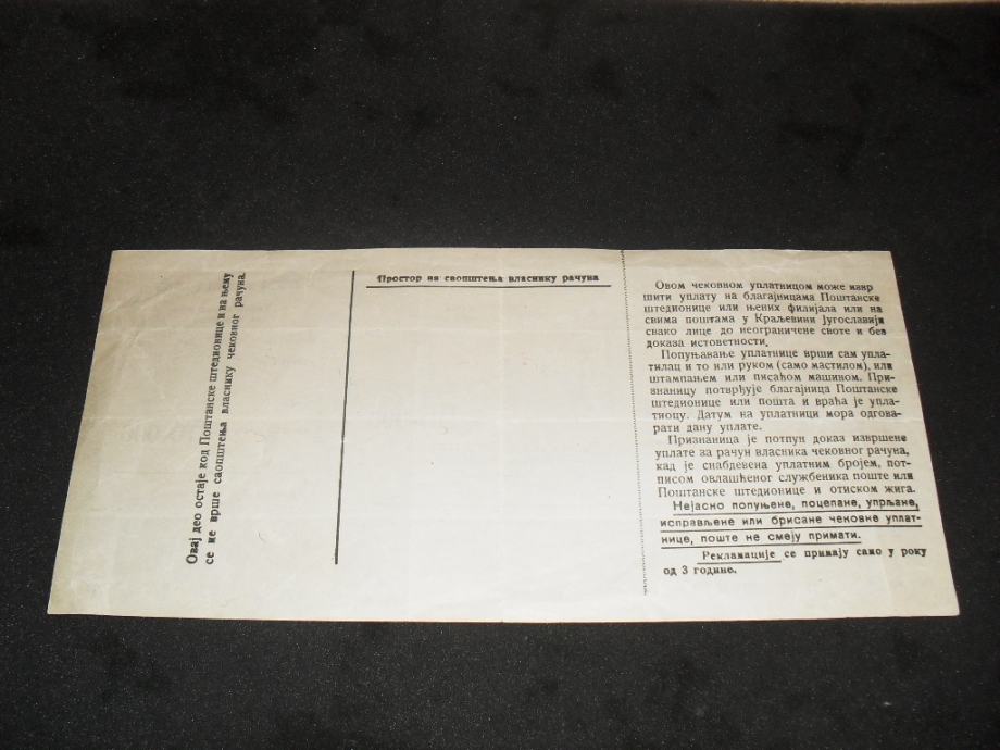 Odlično očuvna ČEKOVNA UPLATNICA - KRALJEVINA JUGOSLAVIJA. Nepopunjena - Blanko.