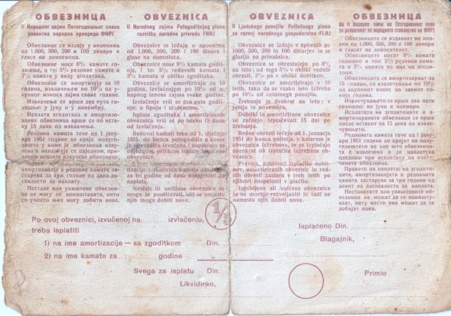 OBVEZNICA - II NARODNI ZAJAM - 16.10.1952 g