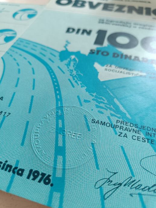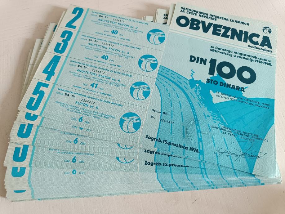 Obveznice za izgradnju magistralnih cesta u SR Hrvatskoj u razdoblju 1976-1980 u vrijednosti 100 dinara. S neiskorištenim kuponima (1. fali).