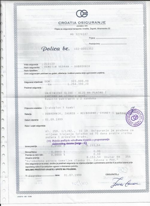 Originalna Polica osiguranja sa slikarske turneje po Australiji iz 1999. godine.