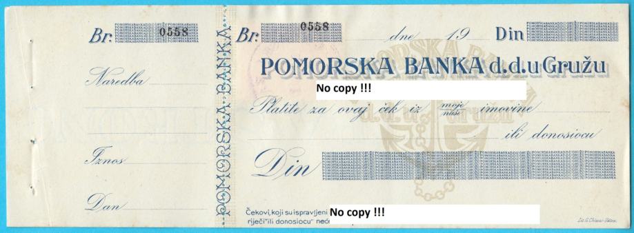 POMORSKA BANKA U GRUŽU (Dubrovnik) neiskorišteni ček * taksena marka
