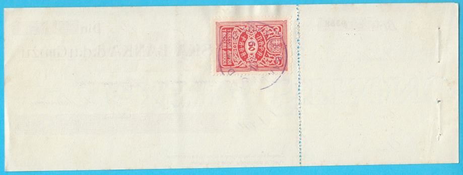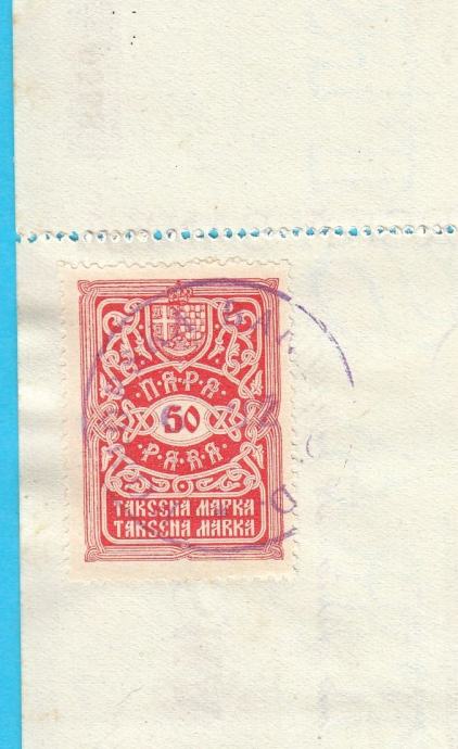 Na poleđini se nalazi taksena marka iz Kraljevine od 50. para.