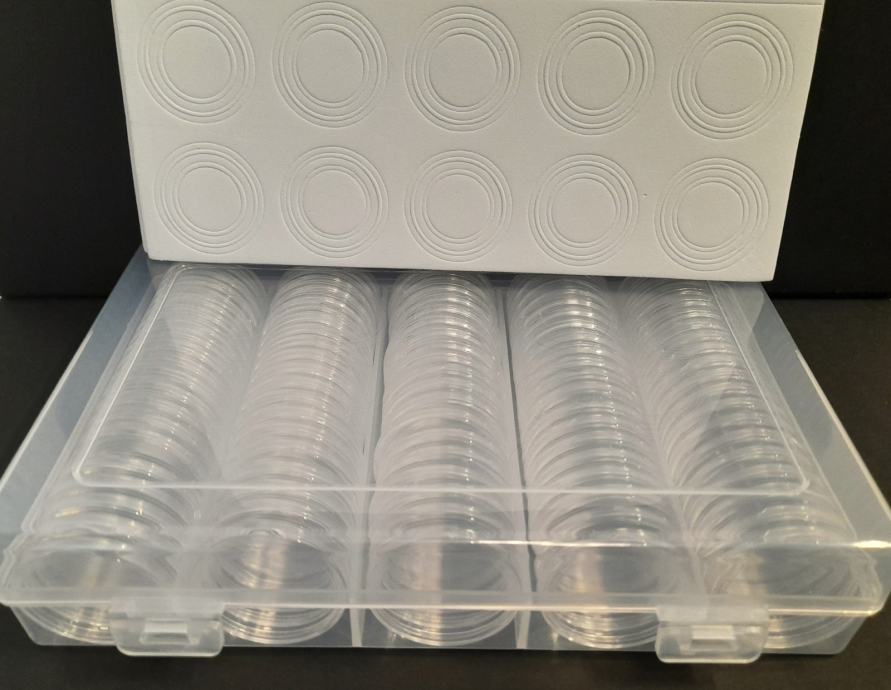 Set 100 kapsula za kovanice promjera do 30 mm (idealno za kovanice od 2 EUR) + KUTIJA + BIJELI UMETCI