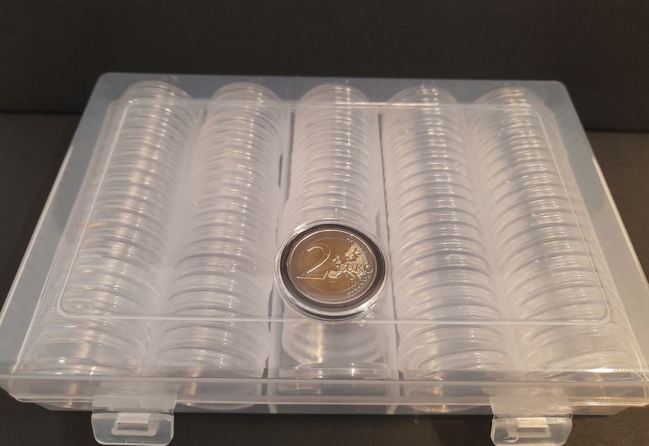 Set 100 kapsula za kovanice 30 mm + kutija + umetci (IDEALNO ZA 2 EUR)